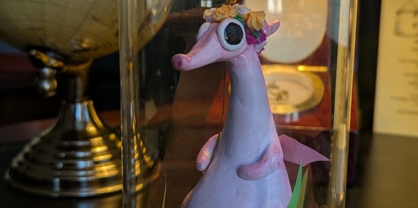 Hand sculpted & painted ceramic figuring presented under a glass dome on a wooden plinth.